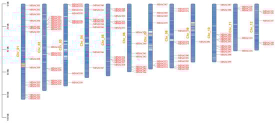 Chromosomal localization of MlNAC genes. Chromosome numbers are displayed at the middle point of each chromosome. The scale bars on the left denote genomic length in mega-bases (Mb). Red regions on each chromosome signify high gene density. Blue regions indicate low gene density.