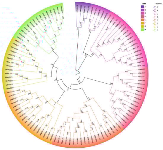 Phylogenetic analysis of MlNAC genes. A neighbor-joining (NJ) phylogenetic tree was constructed by MEGA 11.0, using full-length MlNAC protein sequences with 1000 bootstrap replicates. The 109 NAC proteins were classified into eight distinct subgroups (A–H). We highlighted each subgroup by a unique color.