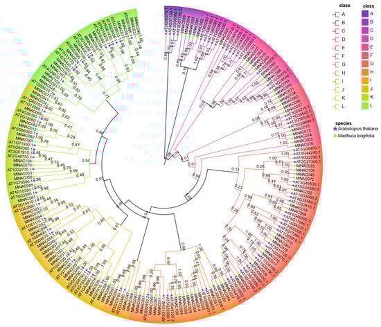 Phylogenetic analysis of Madhuca longifolia and Arabidopsis thalian NAC genes. An NJ phylogenetic tree was generated by MEGA 11.0, based on full-length NAC gene sequences from both species with 1000 bootstrap replicates. Purple pentagrams preceding AtNAC entries denote A. thaliana genes. Green triangles preceding MlNAC entries represent M. longifolia genes. All NAC genes were classified into 12 distinct subfamilies (A–L). Each subgroup was labeled with a unique color.