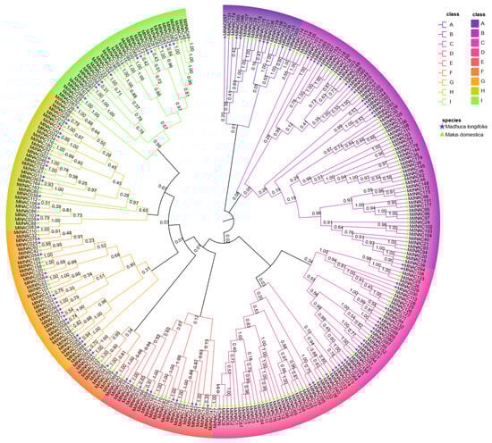 Phylogenetic analysis of Madhuca longifolia and Malus domestica NAC genes. An NJ phylogenetic tree was constructed by MEGA 11.0, using full-length MlNAC and MdNAC sequences with 1000 bootstrap replicates. Purple pentagrams preceding MlNAC entries denote M. longifolia genes. Green markers preceding MdNAC entries represent M. domestica genes. The 109 NAC genes were classified into nine distinct subfamilies (A–I). Each subgroup was highlighted with a unique color.