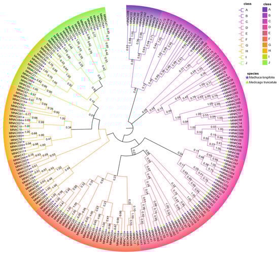 Phylogenetic analysis of Madhuca longifolia and Medicago truncatula NAC genes. An NJ phylogenetic tree was constructed using NAC gene sequences from both species (1000 bootstrap replications). Purple pentagrams preceding MtNAC entries denote M. truncatula genes. Green triangles preceding MlNAC entries represent M. longifolia genes. All NAC genes were classified into 12 distinct subfamilies (A–J), each highlighted with a unique color.