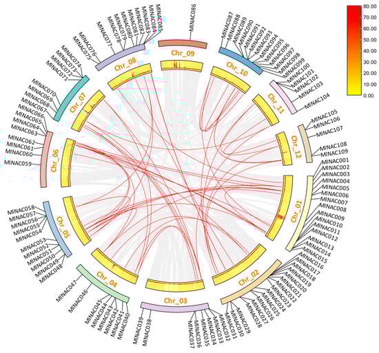 The collinearity analysis of 109 NAC genes is visualized in a circular layout. Gray lines within the inner circle denote intrachromosomal collinear blocks in M. longifolia. Red lines highlight replication events associated with MlNAC genes. Chromosome names and NAC gene names are, respectively, labeled on the inner and outer sides of each chromosome. Heatmap and lines illustrate gene density distribution. The redder the color, the higher the gene density.