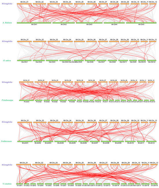 To investigate the evolutionary relationships of the NAC gene family in M. longifolia, interspecific collinearity analysis was performed using the “MCscanX” tool embedded in TBtools. Genomic data of five species (Populus trichocarpa, Arabidopsis thaliana, Oryza sativa, Vitis vinifera, and Solanum tuberosum) were retrieved from the Phytozome database (https://phytozome-next.jgi.doe.gov/, accessed on 13 February 2025) []. Genome-wide alignment results were processed by “MCscanX” to identify collinear gene pairs between M. longifolia and each target species, with an E-value threshold of 1 × 10−10. Potential gene duplication events (e.g., tandem or segmental duplications) were examined by filtering collinear regions where a single gene corresponded to multiple homologs. Visualization of syntenic blocks was achieved via the “Dual Systeny Plot” module in TBtools, with customized chromosome order and color schemes to highlight evolutionary patterns. The analysis focused on collinear pair counts and chromosomal distribution patterns to elucidate genomic drivers of evolutionary divergence.