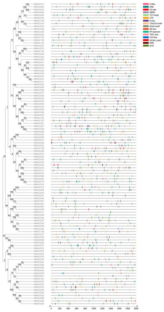 The cis-acting elements of the promoter sequences of NAC genes in M. longifolia were predicted. The 17 squares on the right represent the various cis-acting elements of the promoter. And the Neighbor-Joining phylogenetic tree on the left indicates the similarities among NAC genes.