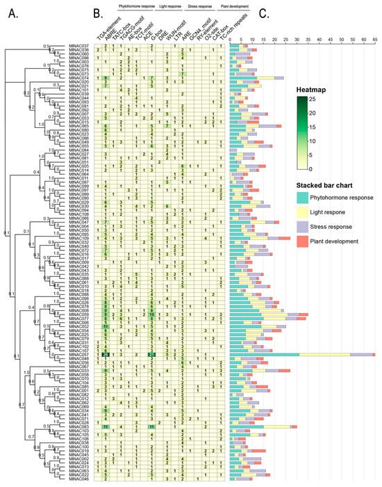 Analysis of the number of cis-acting elements in M. longifolia. (A) The phylogenic tree of NAC genes in M. longifolia. (B) Heatmap of the number of cis-acting elements in the corresponding gene. The count of cis-acting elements is in the box. (C) The stacked bar chart visualizes the number of four-kind elements. The elements are classified into four groups: Phytohormone, Light response and Plant development.