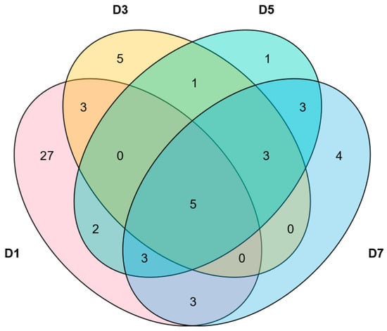 Venn diagram of MlNAC genes with differential expression on the 1st, 3rd, 5th, and 7th days (D1, D3, D5 and D7) under low temperature conditions.
