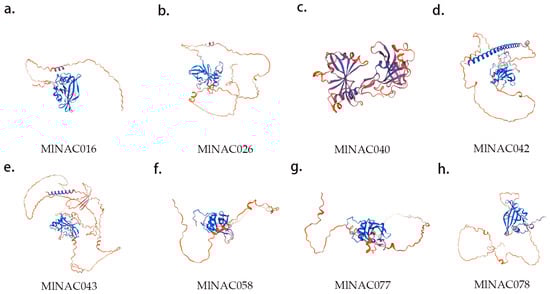 Three-dimensional structure of 8 key MlNAC proteins. (a) Three-dimensional structure of the protein in sub-family F, MlNAC006. (b) Three-dimensional structure of the protein in sub-family E, MlNAC016. (c) Three-dimensional structure of the protein in sub-family F, MlNAC26. (d) Three-dimensional structure of the protein in sub-family E, MlNAC040. (e) Three-dimensional structure of the protein in sub-family E, MlNAC042. (f) Three-dimensional structure of the protein in sub-family E, MlNAC043. (g) Three-dimensional structure of the protein in sub-family F, MlNAC077. (h) Three-dimensional structure of the protein in sub-family F, MlNAC078.