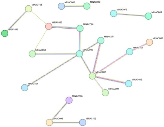 Visualization of the protein–protein interaction of MlNACs using the STRING 12.0 online tool with Arabidopsis thaliana as the reference genome. Notably, the proteins (MlNAC058, MlNAC080, MlNAC082, MlNAC086, MlNAC098, and MlNAC101) are present even at high confidence levels. They are more likely to be key nodes.
