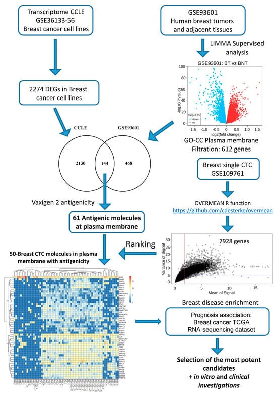 Workflow of the bioinformatics analyses. We observed that 114 genes were expressed in the diversity of CCLE BC cell lines and overexpressed on the plasma membrane of human breast tumor cells. Among them, 61 molecules were classed as antigenic by the Vaxijen2 algorithm. Finally, 50 of them were verified to be expressed in BC CTCs according to the single-cell transcriptome analysis.