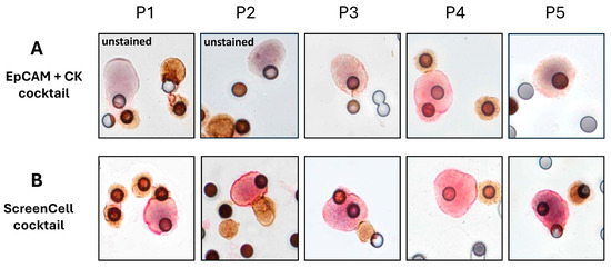 Representative images of ICC staining performed using conventional and ScreenCell cocktails in patients’ samples. Blood samples of the BC patients were processed with ScreenCell Cyto technology to isolate their CTCs. Leukocytes are stained in brown using an anti-CD45 antibody, and CTCs are stained in red using EpCAM + CK cocktail (A) or ScreenCell cocktail (B) from the same patients. The cell nucleus is stained with hematoxylin. Images are captured at 40×. P: patient.