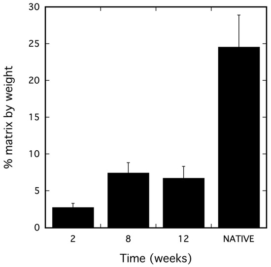 Percent matrix (dry weight/wet weight) for dSRC samples as a function of time and for native cartilage.