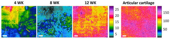 Biochemical results between the dSRC and control groups were presented as mean ± standard deviation (SD). Statistical significance was determined by Student’s t-test, with a statistically significant difference set at p < 0.05 in all statistical tests. For biomechanical analysis, values of |G*| were spatially mapped in all 3 samples for each of the dSRC maturation times, and the native cartilage was combined for statistical comparison between any pair of categories. Statistical significance was determined by the Wilcoxon-type nonparametric Kruskal–Wallis test with a significant difference in chi-squared statistics on the group-adjusted (Bonferroni correction for multiple comparisons among groups) two-sided pairwise comparison set at p < 0.05. Statistical analysis was conducted with MATLAB 2022a.