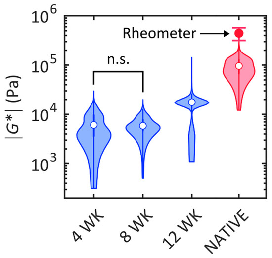 Shear modulus of native cartilage and dSRC matrix at 4, 8, and 12 weeks measured with SHEAR (violins) and a mechanical rheometer (red marker with error bars for native cartilage). For SHEAR, the violin shape represents the distribution of the magnitude of shear modulus, |G*|, over a region of 1.9 mm × 2.1 mm in 3 specimens for each category; the white marker indicates the median value. Nonparametric multiple comparisons with the Kruskal–Wallis test indicate a statistically significant difference (p < 0.0001) in the distribution of |G*| values between all pairs of categories except between dSRC at 4 and 8 weeks (n.s.: not significant). For the rheometer, the marker and error bar represent the mean ± standard deviation of 4 specimens.