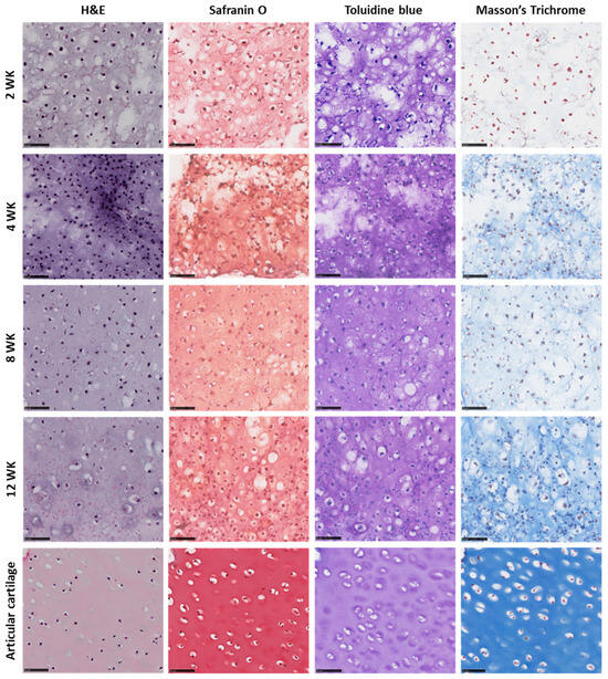 Representative histology of native cartilage and dSRC matrix at 2, 4, 8, and 12 weeks. Stains used were H&E (cell density), Safranin O (GAGs), Toluidine blue (collagen), and Masson’s Trichrome. Scale bar = 50 µm.