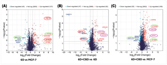 Volcano plots of differential protein expression in the MCF-7, 6D, and 6D+CBD cells obtained by mass spectrometry. (A) Distribution of all differentially expressed proteins in the 6D cells vs. control MCF-7 cells. (B) Differential protein distribution in the 6D+CBD vs. 6D cells. (C) Differential protein distribution in the 6D+CBD vs. control MCF-7 cells. In all graphs, up-regulated proteins (log2FC ≥ 1) are shown as red points and down-regulated (log2FC ≤ −1) ones as blue points, proteins with not-significative changes in the expression are shown as purple points. Data are displayed according to the log2Fold change (horizontal axis) and −log10 of the p-value (vertical axis). The black-dotted line on the vertical axis indicates the limits for significance (−log10Pvalue ≤ 0.05). The top five up-regulated and down-regulated proteins are indicated according to their gene symbols. KRT16 and RPRD2, circled in red, were up-regulated by IL-1β and down-regulated by CBD. PTPRD, S100P, and AKR1C3, circled in green, exhibited similar expression patterns in both, 6D vs. MCF-7 and 6D+CBD vs. MCF-7 comparisons. The CBD up-regulated proteins ERCC6 and HFM1 are indicated with purple circles.