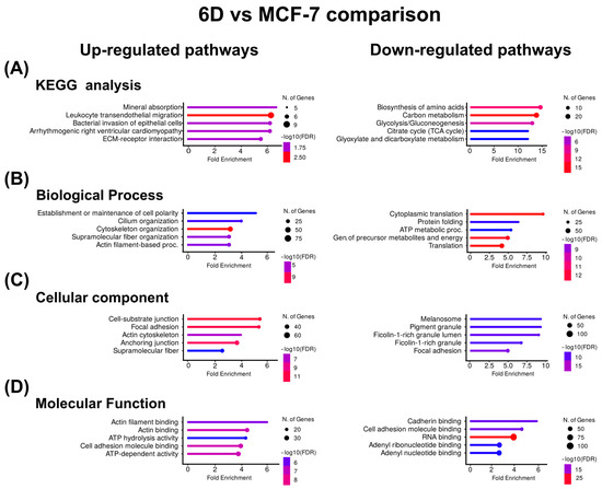 KEGG and Gene Ontology analyses of the proteins with co-expressed patterns identified in the 6D vs. MCF-7 comparison. (A) KEGG pathways identified in the up-regulated and down-regulated proteins. (B) Pathways associated with biological processes. (C) Pathways associated with cellular component. (D) Pathways associated with molecular function. In each case, only the five pathways with the highest enrichment are shown.