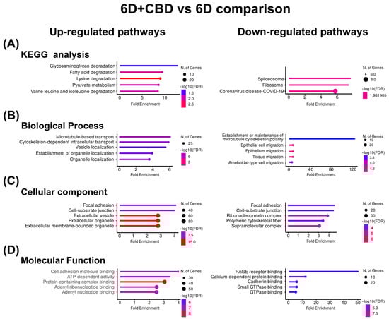 In the 6D+CBD vs. 6D cells comparison, the KEGG enrichment of the CBD up-regulated proteins reveals that these proteins were associated with the pathways of degradation of glycosaminoglycan and fatty acids (Figure 4A). GO identified the pathways of microtubule-based transport and cytoskeleton-dependent intracellular transport for biological processes, focal adhesion and cell-substrate junction for cellular component, and cell adhesion, molecular binding, and ATP-dependent activity for molecular function (Figure 4B–D). Although in the CBD, down-regulated proteins, KEGG and GO, analyses indicated spliceosome and ribosome for KEGG, establishment or maintenance of microtubule cytoskeleton polarity and epithelial cell migration for biological process (Figure 4B), focal adhesion and cell-substrate junction for cellular component (Figure 4C), and RAGE receptor binding and calcium-dependent protein binding for molecular function (Figure 4D). As shown in Table 4, the most up-regulated protein after CBD treatment is the autophagy-related protein 101 (ATG101), while the most down-regulated is the caspase recruitment domain-containing protein 11 (CARD11).
