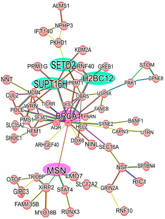 Protein-protein interaction network of up-regulated proteins in 6D+CBD vs. MCF-7 cells. The main network of CBD up-regulated proteins with a log2FC ≥ 1 was formed with 58 proteins. The interaction of the key axis formed by the proteins SUPT16H, SETD2, and H2BC12 (highlighted in green) with BRCA1 and MSN (highlighted in pink) is shown. This interaction analysis was performed using STRING, considering only the statistically significant up-regulated proteins.
