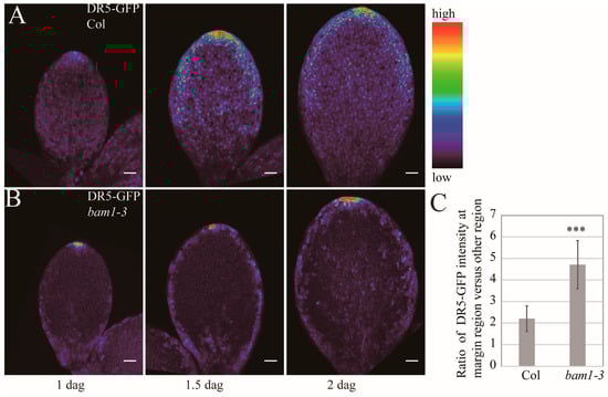 2.3. Margin Cells of bam1-3 Mutants Show Abnormal Auxin Response Monitored by an Auxin Response Marker