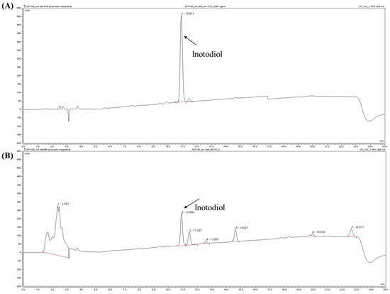 High-performance liquid chromatography (HPLC) chromatograms of inotodiol. Representative HPLC chromatograms of inotodiol standard (A) and INO10 from Inonotus obliquus (B).