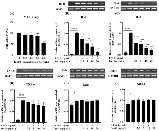 Measurement of INO10 cytotoxicity and establishment of an LPS-induced inflammation model. (A) BV2 cell viability was assessed following treatment with increasing concentrations (0–100 μg/mL) of INO10 for 24 h. Cytotoxicity was evaluated using an MTT assay. (B–F) BV2 cells were treated with LPS (0.1 μg/mL), and the mRNA expression levels of IL1β (B), IL-6 (C), TNF-α (D), Rela (E), and Nfkb1 (F) were analyzed by qRT-PCR. Data are presented as mean ± SD. Statistical significance is indicated as follows: * p < 0.05; ** p < 0.01; *** p < 0.001; **** p < 0.0001 vs. the LPS-treated group. # p < 0.05, #### p < 0.0001 vs. the control group.