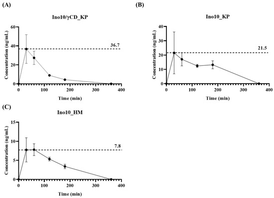 Plasma concentration–time curve of inotodiol following oral administration of different formulations. (A) INO10/γCD_5% KP: inclusion complex of 10% inotodiol with γ-CD at a molar ratio of 1:3 in 5% Kolliphor; (B) INO10_5% KP, 10% inotodiol in 5% Kolliphor; (C) INO10_5% HM: 10% inotodiol in 5% HPMC. Data are presented as mean ± SD (n = 3).