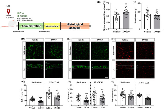 The ameliorative effect of INO10 on cognitive function in 3xTg mice. (A) Schematic representation of the experimental design. Female 3xTg mice were orally administered INO10 (5 mg/kg) or vehicle for 3 months from 4 to 7 months of age, followed by the Y-maze test and histological analysis. (B) Spontaneous alternation performance was assessed in the Y-maze test 24 h after the final administration. INO10-administered 3xTg mice (n = 15) showed a significant increase in spontaneous alternation percentage compared to vehicle-administered 3xTg mice (n = 15). (C) The total number of arm entries during the 8 min test period was not significantly different between the groups. (D–F) Representative immunofluorescence images of brain sections stained for 4G8 (D), AT8 (E), and Iba-1 (F) in the subiculum and stratum pyramidale (SP) of CA1. Scale bars = 50 μm. (G–I) Quantification of immunoreactivity for 4G8 (G), AT8 (H), and Iba-1 (I) in the subiculum and SP of CA1. Values are expressed as mean ± SEM. ** p < 0.01, *** p < 0.001 compared with the vehicle-treated 3xTg mice (black bar).