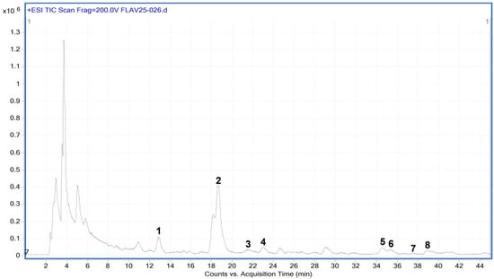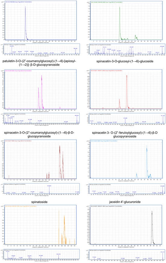 The HPLC-ESI-TOF-MS analysis showed the presence of eight flavonoids (Figure 1) identified as follows: patuletin-3-O-β-d-glucopyranosyl-(1→6)-[β-d-apiofuranosyl-(1→2)]-β-d-glucopyranoside, spinacetin-3-O-glucosyl-(1→6)-[apiosyl-(1→2)]-β-D-glucopyranoside, patuletin-3-O-(2″-coumaroylglucosyl)-(1→6)-[apiosyl-(1→2)]-β-D-glucopyranoside, spinacetin-3-O-glucosyl-(1→6)-glucoside, spinacetin-3-O-(2″-coumaroylglucosyl)-(1→6)-β-D-glucopyranoside, spinacetin 3-O-(2″-feruloylglucosyl)-(1→6)-β-D glucopyranoside, spinatoside, and jaceidin 4′-glucuronide (Table 1; Figure 2).