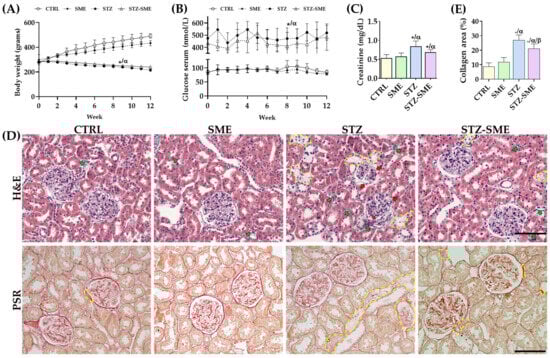 During the 12-week experimental period, the STZ and STZ-SME groups exhibited significant hyperglycemia and lower body weight than the control (CTRL) and SME groups (p = 0.0001); Figure 3A,B). However, serum creatinine levels were significantly lower in the STZ-SME group than in the STZ group (p = 0.047), with no significant differences observed between the CTRL and SME groups (Figure 3C).