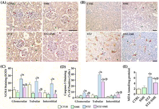 Effect of SME on STZ-induced nephrotoxicity. (A,B) Representative images showing the localization of NOX4 (magnification 100×) and casp-3 staining (magnification 200×) in the CTRL, SME, STZ, and STZ-SME groups. (C) Integrated optical density (IOD) for NOX4, (D) percentage of positive cells for casp-3 staining, and (E) MDA levels in kidney tissue. Red, yellow, and green arrows indicate positively stained glomerular, tubular, and interstitial cells, respectively. * p < 0.05 vs. CTRL; α p < 0.05 vs. SME; β p < 0.05 vs. STZ. Data are presented as the mean ± SD (n = 8). Scale bar = 100 μm.