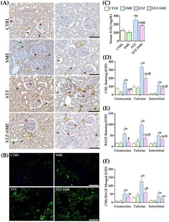 Effect of SME on the levels of CML-modified proteins and RAGE expression in the kidney cortex. (A) Total serum levels of advanced glycation end-products (AGEs) in the CTRL, SME, STZ, and STZ-SME groups. (B) Distribution of CML and RAGE in kidney tissue. (C) serum levels of AGEs (ng/dL), (D,E) IOD measurements for CML and RAGE immunohistochemistry. (E) Fluorescence colocalization images of CML and RAGE. (F) IOD values of CML/RAGE colocalization. Red, yellow, and green arrows indicate positively stained tubular, glomerular, and interstitial cells, respectively. Data are expressed as the mean ± SD (n = 8). * p < 0.05 vs. CTRL, α p < 0.05 vs. SME, and β p < 0.05 vs. STZ. Magnification: 200×. Scale bar = 100 μm.