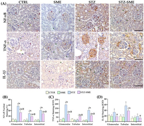 Effect of SME on STZ-induced kidney inflammation. (A) Representative images showing the distribution of nuclear NF-κB, TNF-α, and IL-1β in the kidney cortex of the CTRL, SME, STZ, and STZ-SME groups. Red, yellow, and green arrows indicate positively stained glomerular, tubular, and interstitial cells, respectively. (B) Percentage of cells positively stained for nuclear NF-κB, and (C) IOD measurements for TNF-α and (D) IL-1β. Data are expressed as the mean ± SD (n = 8). * p < 0.05 vs. CTRL, α p < 0.05 vs. SME, and β p < 0.05 vs. STZ. Magnification: 200×. Scale bar = 100 μm.