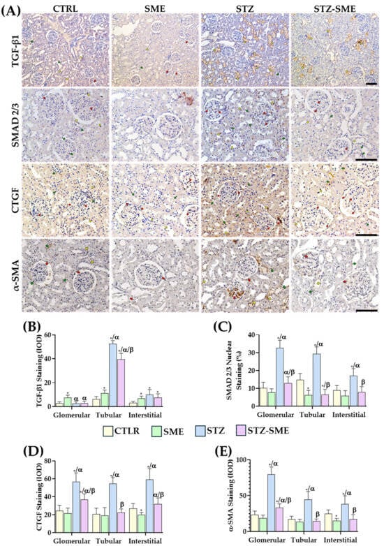 Effect of SME on STZ-induced kidney fibrosis. (A) Representative images showing the localization of TGF-β1, SMAD 2/3, CTGF, and α-SMA staining in the kidney cortex of the CTRL, SME, STZ, and STZ-SME groups. Red, yellow, and green arrows indicate positively stained glomerular, tubular, and interstitial cells, respectively. (B) IOD measurements for TGF-β1 (Magnification: 100×), (C) α-SMA, (D) CTGF, and (E) percentage of cells positively stained for nuclear SMAD2/3 (Magnification: 200×). Data are expressed as the mean ± SD (n = 8). * p < 0.05 vs. CTRL, α p < 0.05 vs. SME, and β p < 0.05 vs. STZ. Scale bar = 100 μm.