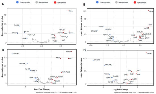 Volcano plots depicting differentially expressed sRNAs in Y. ruckeri biofilms. Volcano plots illustrate the differential expression of sRNAs between planktonic cells (0 h) and biofilm samples collected at (A) 4 h, (B) 6 h, (C) 12 h, and (D) 24 h. Upregulated sRNAs are shown in red, downregulated in blue, and non-significant sRNAs in gray. Functional annotations and gene identifiers are listed in Table S1. Volcano plots were generated using the R package v.4.4.1 “EnhancedVolcano” v.1.26.0.