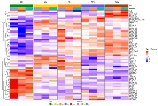 To explore the transcriptional dynamics of sRNA expression during biofilm formation, volcano plots and heatmaps were used to visualize differentially expressed sRNAs identified through DESeq2 analysis based on normalized counts. Visualizations were generated using the R packages via ggplot2, Heatmapper, and VolcaNoseR8 [22,23]. Figure 1 provides the differential expression profiles across four biofilm development times (4, 6, 12, and 24 h), each compared to the planktonic condition (0 h). Two dominant regulatory patterns emerged: a subset of sRNAs showed progressive upregulation as the biofilm matured, while others were significantly downregulated during the transition from planktonic to sessile growth. In the heatmap, we observed the expression dynamics of the most representative RNAs during biofilm development, among which we can identify conserved sRNAs previously reported in the biofilm process in enterobacteria (Figure 2). In addition, Yersinia-specific sRNAs (Yrs) appeared, which have not previously been linked or characterized under biofilm conditions. The sRNAs identified in the trancriptomic analysis were named based on the sequence identity (>80%) with sRNAs categorized in the Rfam database [24] (Table S1). Interestingly, transcripts corresponding to sRNAs with more than one copy are observed, as in the case of Ysr224, whose multiple copies show percentages of identity ranging from 80 to 91%, but with different expression profiles during biofilm formation (Figure 2).
