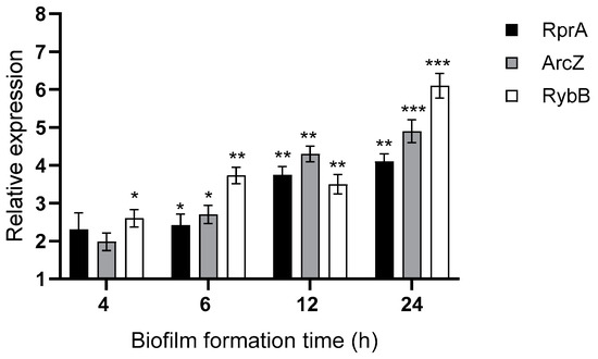 Relative expression of ArcZ, RprA, and RybB sRNAs in Y. ruckeri that forms biofilms. Wild-type strain was grown without shaking at 22 °C on silicate covers for the indicated times. Adherent cells were recovered by low-frequency sonication and subjected to total RNA extraction. Gene expression was quantified by RT-qPCR and is shown relative to the time 0 h of biofilm formation (initial inoculum of planktonic cells). Asterisks represent statistically significant differences with respect to the time 0 h (*** p < 0.001, ** p < 0.01, * p < 0.05). Data represent the means ± standard deviations (n = 3).