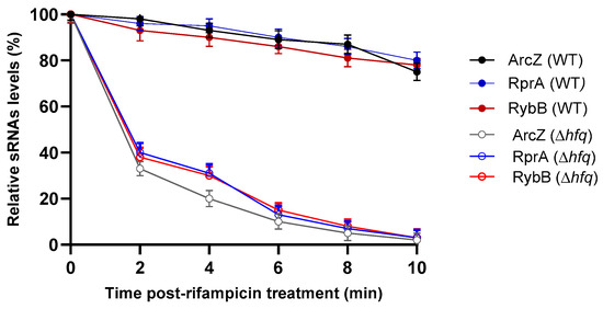 Hfq-dependent stability of Y. ruckeri sRNAs. sRNA stability was assessed in wild-type (WT) and ∆hfq strains following transcription inhibition with rifampicin. Total RNA was extracted at the designated time points and quantified using RT-qPCR. sRNA levels are expressed as a percentage relative to the initial time point (0 min). Data represent the means ± standard deviations (n = 3).