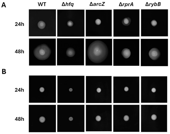 Motility is crucial during the early stages of biofilm formation, as it enables bacteria to locate and adhere to abiotic surfaces. To assess whether Hfq and its associated sRNAs (ArcZ, RprA, and RybB) influence this trait, we conducted swimming and swarming assays on 0.3% and 0.5% (w/v) TSA agar, respectively, incubating the plates for 24 and 48 h. The Δhfq strain exhibited a marked reduction in swimming at 48 h (Figure 5A) and reduced swarming at both 24 and 48 h (Figure 5B). By contrast, ΔarcZ demonstrated enhanced swimming at 48 h, whereas ΔrprA and ΔrybB mutants showed significantly decreased swimming at both time points (Figure 5A). Swarming remained unchanged in ΔarcZ, ΔrprA, and ΔrybB strains compared to the wild type (Figure 5B). These findings highlight the importance of Hfq and these sRNAs in modulating motility, a key factor not only for both initial surface attachment, but also for biofilm dispersal. The diameter of motility halos and statistical significances are shown in Supplementary Figure S1.