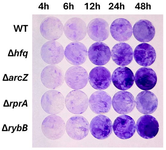 Crystal violet biofilm assays for Y. ruckeri strains. Wild-type (WT), Δhfq, and ΔsRNA strains were grown on silicate covers without shaking at 22 °C for the indicated durations (4, 6, 12, 24, and 48 h). The covers were then stained with 1% (v/v) crystal violet to visualize biofilm formation. Representative images from each time point are shown (n = 5).