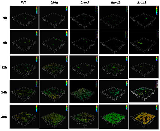 Confocal microscopy analysis of Y. ruckeri biofilms. Wild-type (WT) and mutant strains (Δhfq, ΔrprA, ΔarcZ, and ΔrybB) were grown on silicate covers without shaking at 22 °C for the indicated times (4, 6, 12, 24, and 48 h). After incubation, covers were washed and fixed with 4% paraformaldehyde. Samples were visualized on a Leica TCS SP8 confocal microscope at 6000× magnification, and images were reconstructed using LAS X software 3.1.5. The color scale (heatmap) in each panel represents the depth (Z-axis) of the biofilm in micrometers (µm). Representative images from each time point are shown (n = 3).