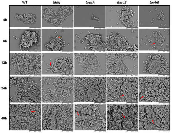 Scanning electron microscopy analysis of Y. ruckeri biofilms. Wild-type (WT), Δhfq, and ΔsRNA (ΔrprA, ΔarcZ, and ΔrybB) strains were grown on silicate covers at 22 °C for the indicated times without shaking. After incubation, covers were washed and fixed with 2.5% glutaraldehyde, followed by critical point drying and gold coating. Samples were then imaged at 6.0 K magnification using a Hitachi TM3000 microscope (Hitachi High-Tech, Tokyo, Japan), providing a detailed view of the biofilm architecture under each condition. Red arrows indicating extracellular components and/or appendages. Representative images from each time point are shown (n = 3).