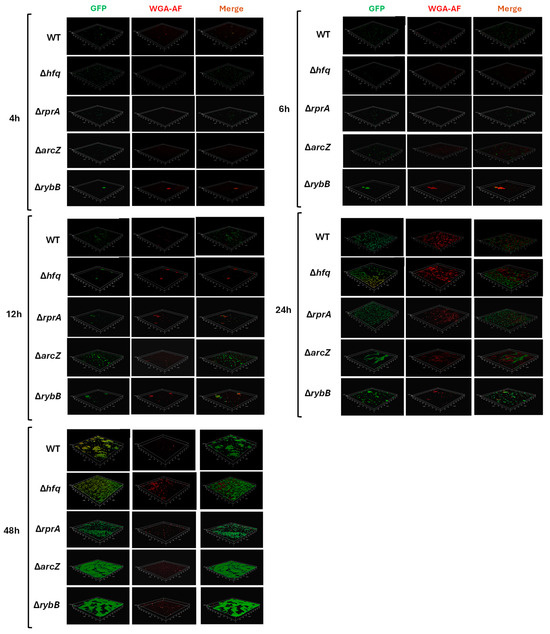 At 4 h of biofilm formation, PNAG was present in all strains with no noticeable differences (Figure 9. However, at later time points (24 and 48 h), the Δhfq strain exhibited a significantly higher density of PNAG compared to the wild type (Figure 9). In contrast, the deletion of the RprA sRNA did not showed differences in PNAG levels at any examined time point (Figure 9). The ΔarcZ strain displayed no significant differences at early stages (4 and 6 h); yet, by 12 h, an increased PNAG density relative to the wild type was evident, a difference that became more pronounced at 24 h (Figure 9). Interestingly, at 48 h, the ΔarcZ strain showed a marked decrease in the PNAG signal, suggesting a subsequent reduction in polysaccharide production. For the ΔrybB strain, initial increases in cell density correlated with elevated PNAG levels; however, similar to ΔarcZ, a decrease in red fluorescence was observed at 48 h, indicating a lower PNAG density than in the wild type.