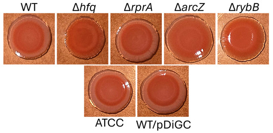 In parallel, we employed Congo red staining to further assess biofilm matrix production (Figure 10). The macrocolony morphology in Congo red agar revealed that the Δhfq, ΔarcZ, and ΔrybB strains exhibited enhanced Congo red binding, consistent with an overproduction of extracellular polysaccharides. Variations in the thickness, color intensity (ranging from pink to red), and ring patterns of the macrocolonies underscore distinct differences in biofilm matrix structure among the strains.
