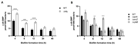 Intracellular c-di-GMP levels in Y. ruckeri biofilms. Wild-type (WT), Δhfq, and ΔsRNA strains were grown without shaking at 22 °C on silicate covers for the indicated times. Adherent cells were recovered by low-frequency sonication, resuspended in phosphate buffer, and subjected to c-di-GMP quantification by ELISA (469/501 nm). Results represent three independent replicates. (A) Comparison between WT and Δhfq. (B) Comparison between WT and ΔarcZ, ΔrprA, and ΔrybB. Asterisks represent statistically significant differences with respect to the WT (**** p < 0.0001; *** p < 0.001, ** p < 0.01). Data represent the means ± standard deviations (n = 3).