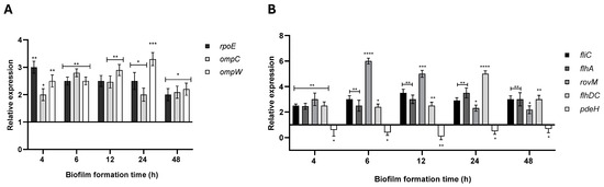 Relative expression of putative RybB and ArcZ target genes in Y. ruckeri. Wild-type (WT), ΔrybB, and ΔarcZ strains were grown without shaking at 22 °C on silicate covers for the indicated times. Adherent cells were recovered by low-frequency sonication and subjected to total RNA extraction. Gene expression was quantified by RT-qPCR and is shown relative to WT. (A) rpoE, ompC, and ompW in ΔrybB. (B) fliC, flhA, rovM, flhDC, and pdeH in ΔarcZ. Asterisks represent statistically significant differences with respect to the WT (**** p < 0.0001; *** p < 0.001; ** p < 0.01; * p < 0.05). Data represent the means ± standard deviations (n = 3).