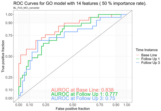 ROC curves for discrimination between MCI converters and stable healthy controls within a follow-up period of 4 years at baseline, 1-year follow-up (Follow Up 1), and 4-year follow-up (Follow Up 3) based on the Gene Ontology (GO) model including 14 features.