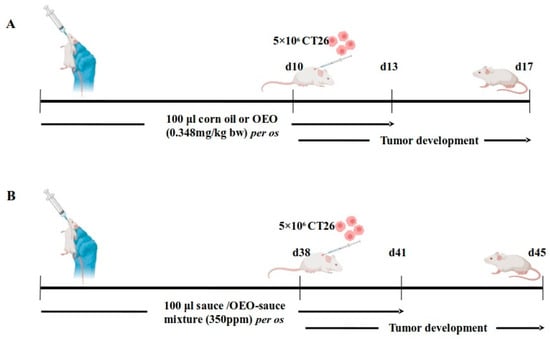 Schematic representation of the preclinical models used. (A) Short-term protocol with daily administration of 0.348 mg/kg body weight of essential oil dispersed in 100 μL corn oil. Control mice received corn oil only. (B) Long-term protocol with daily administration of 350 parts per million (ppm) essential oil emulsion dispersed in tomato juice. Control group received tomato juice mixed with the emulsion carrier, but without essential oil.