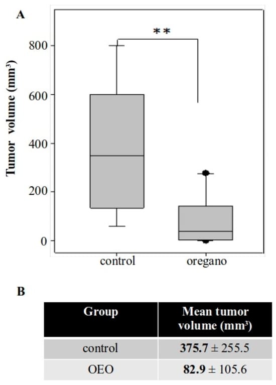 Short-term administration of Origanum vulgare ssp. hirtum essential oil suppressed subcutaneous colorectal tumor development in BALB/c mice. (A) Boxplot of tumor volume from both groups. (B) Mean tumor volume was approximately 78% smaller in mice consuming the essential oil. ** p < 0.01.
