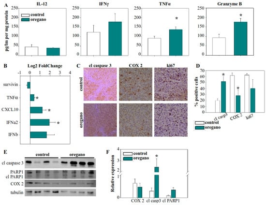 Administration of the tomato sauce supplemented with a low dose of essential oil emulsion induced antitumor immune effects, promoting tumor cell elimination. (A) Cytokine concentration in the tumor lysate of control and oregano-treated mice. (B) Relative gene expression of cytokine genes and survivin in the tumor. GAPDH was used as the housekeeping gene and relative expression was calculated with the 2−ddCt method, with control tumors serving as the reference. (C) Analysis of caspase 3 activation, PARP1 cleavage, and COX-2 protein expression in tumor homogenates with Western blot. (D) Densitometric analysis of cleaved caspase 3, cleaved PARP1, and COX-2 relative protein expression from Western blot images. Relative expression was normalized to tubulin expression for each sample. * p < 0.05.