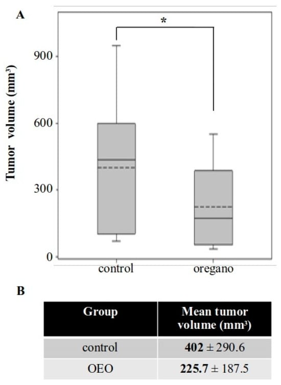 Animals were monitored throughout the experiment and no signs of discomfort or weight loss were observed (Figure S2). Furthermore, there were no differences in the spleen and liver indices of oregano-treated mice (Figure S3). A significant reduction in tumor volume was observed in animals that had received the essential oil, with tumors measuring up to approximately 80% smaller compared with those in control mice (Figure 2A,B).